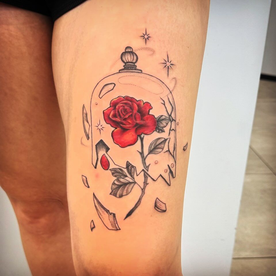 This rose-in-a-dome design feels like a fairy tale captured in ink—romantic, dramatic, and emotionally rich. It brings to mind timeless love, cherished memories, and the beauty of preserving meaningful moments. The bold red rose becomes the heart of the story.