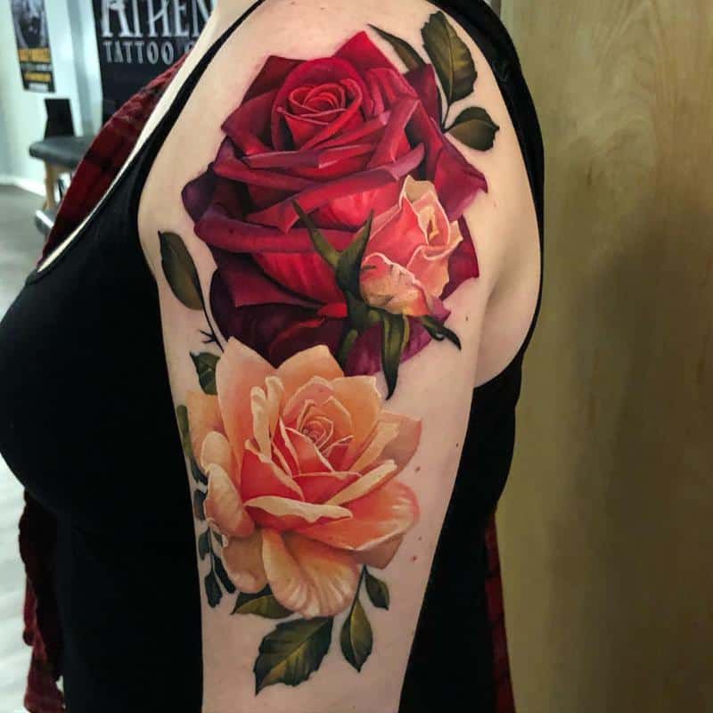17. Bold Realistic Rose Shoulder Tattoo