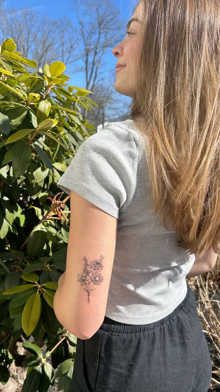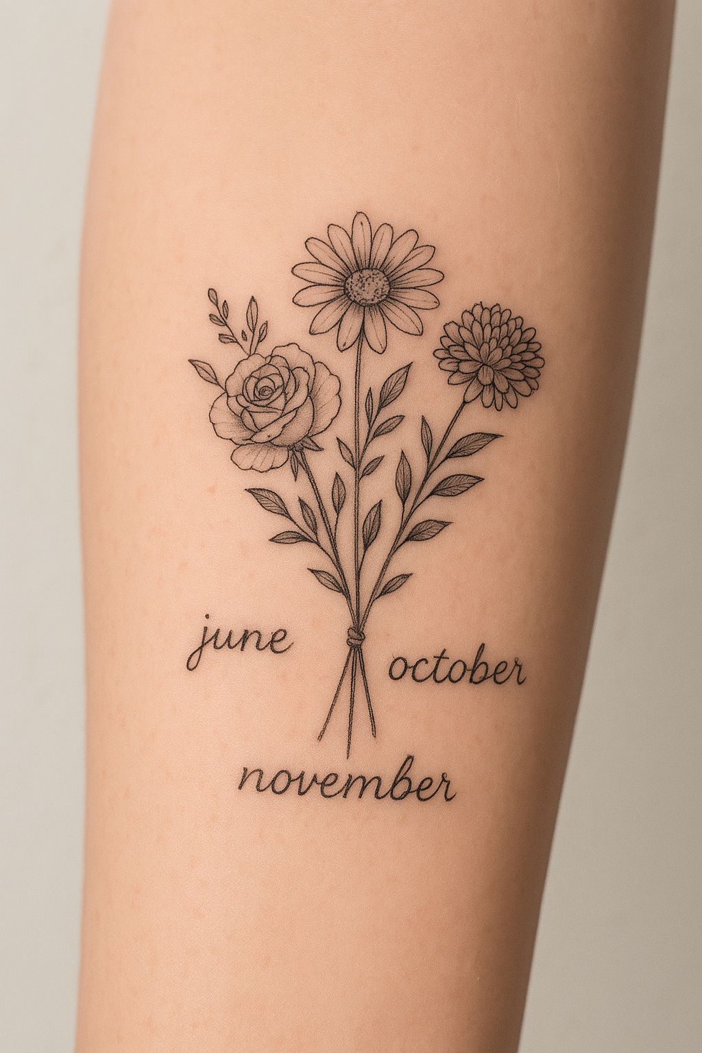 This tattoo feels deeply meaningful, blending June, October, and November birth flowers into one thoughtful bouquet. It carries a sense of connection—between family members, loved ones, or important life chapters—making it both sentimental and visually harmonious.