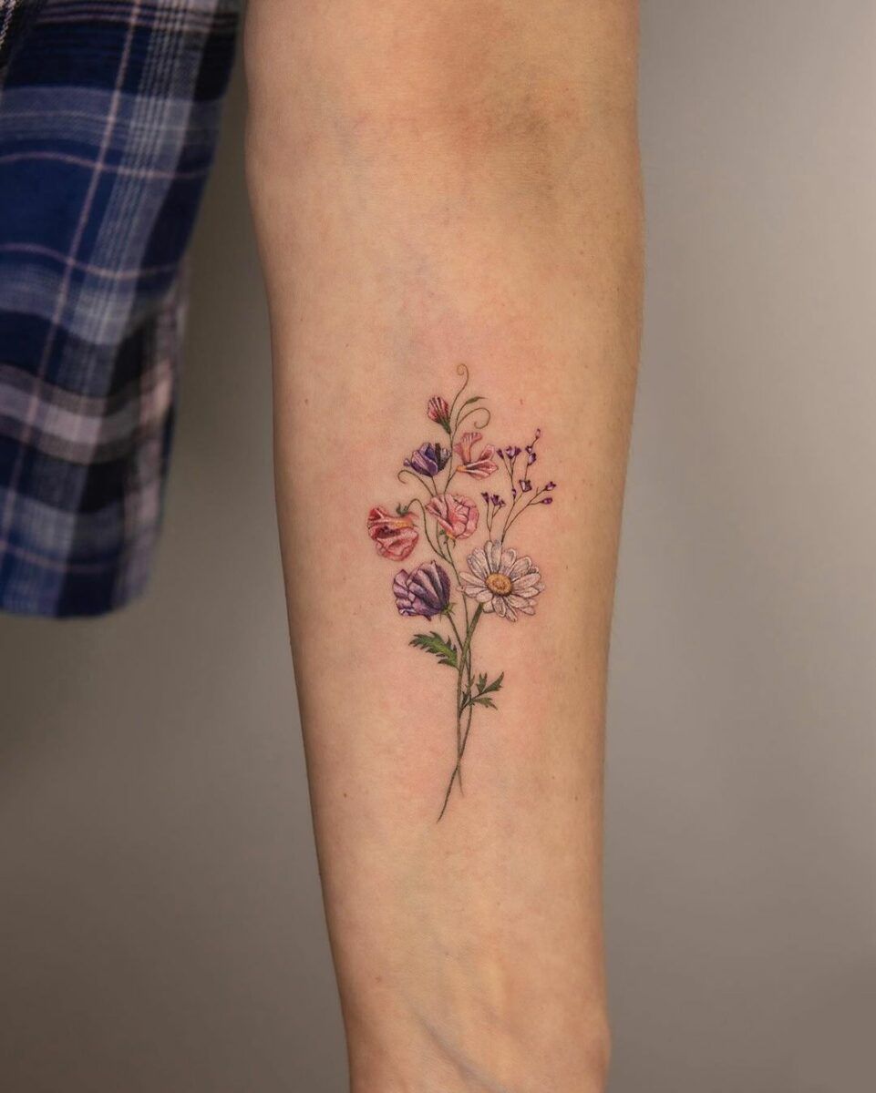 This tattoo feels like a joyful celebration of summer—soft pinks, purples, and warm tones coming together in a lively June birth flower bouquet. It has a cheerful, optimistic energy, almost like holding a freshly picked garden in your hand. The mix of delicate petals creates a sense of movement and lightness that feels youthful yet timeless.