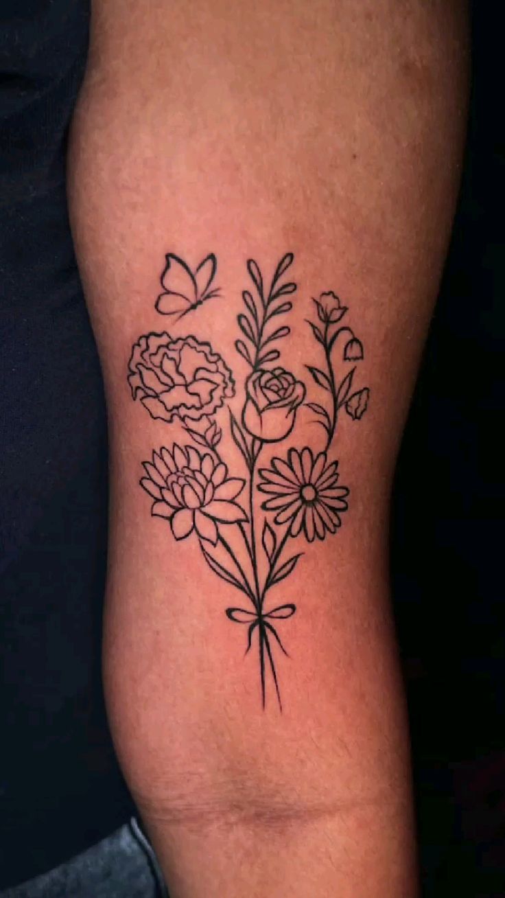 This bouquet tattoo feels lively and symbolic, blending June birth flower blooms with a butterfly for a sense of growth and transformation. It carries a playful, uplifting energy that feels hopeful and full of light.