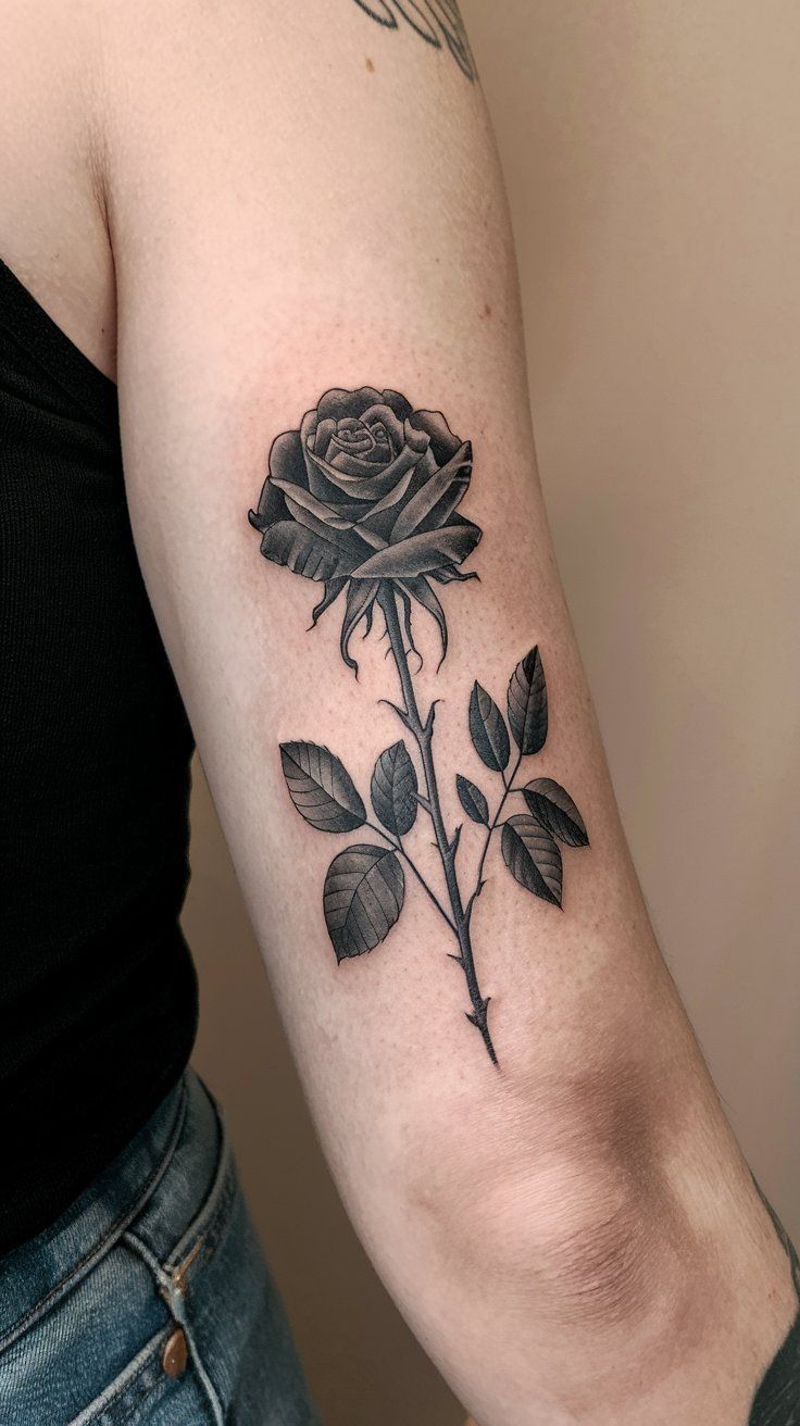 If you love standout rose design ideas, this style is perfect for larger placements like the shoulder or upper arm. It’s ideal for those who want a tattoo that feels expressive, strong, and visually unforgettable.