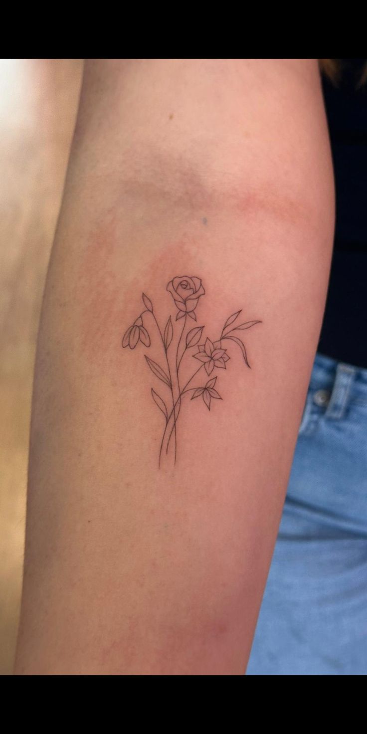 13. Rose and Mixed Birth Flowers Fine Line Tattoo