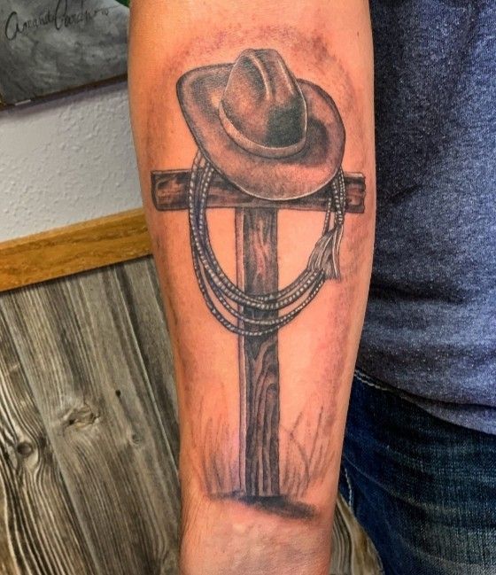 This tattoo carries a quiet, emotional weight. A cowboy hat resting on a wooden cross with rope details feels like a tribute—simple, respectful, and deeply personal. It speaks to legacy, faith, and remembrance, all wrapped in a western symbol that feels grounded and sincere rather than dramatic.