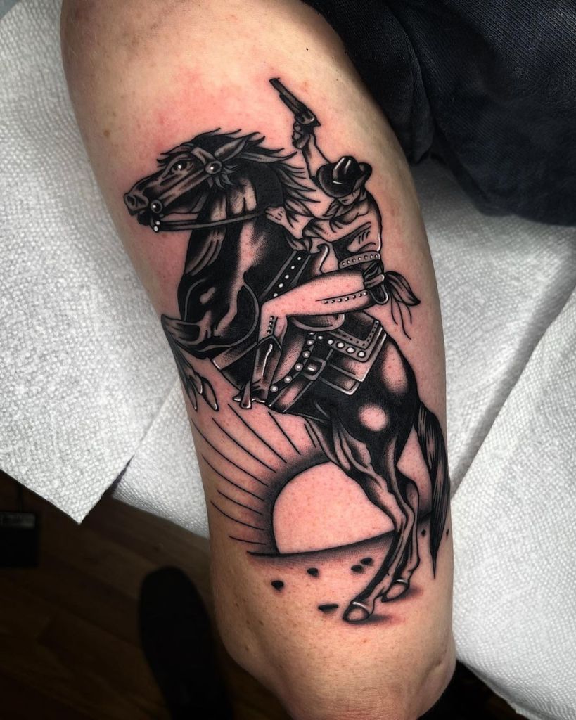 Perfect for fans of American traditional or trad styles, this works well on thighs or arms. It’s a great option if you want cowboy ideas that don’t take themselves too seriously but still feel intentional and well-crafted.