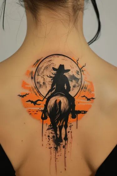 This is storytelling at its finest. A full back piece like this feels epic, almost cinematic, capturing movement, risk, and raw western energy. It’s the kind of tattoo that feels earned—like it marks a significant moment or identity.