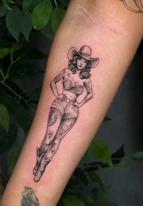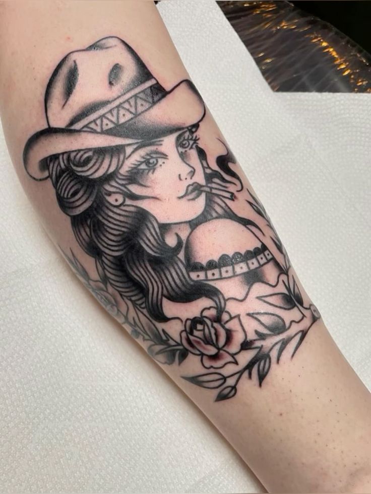 This tattoo feels soft, romantic, and quietly powerful. The cowgirl’s gaze, paired with floral elements, creates a balance between toughness and vulnerability. It’s the kind of design that feels deeply personal, like it represents a chapter of your life.
