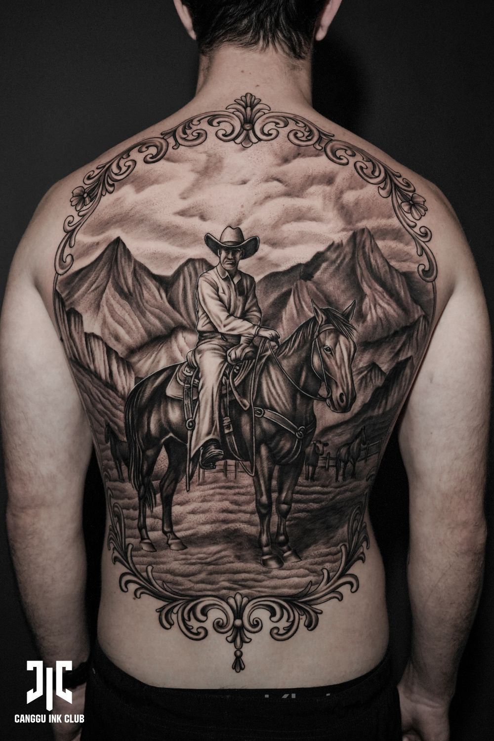 Best suited for men ready to commit to large-scale western design, this works beautifully as a standalone statement. If you’ve ever dreamed of a cowboy-inspired sleeve or back piece that commands attention, this is serious inspiration.