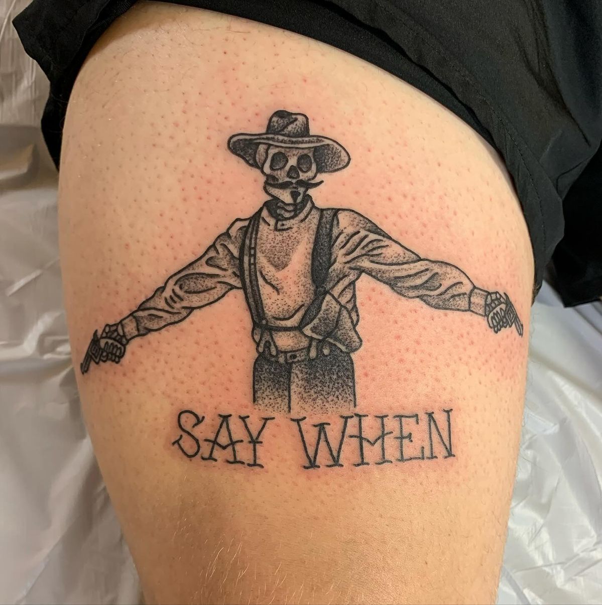 This tattoo feels cheeky, confident, and a little rebellious in a way that instantly makes you smile. The exaggerated pose and stylized anatomy lean into a vintage, almost cartoon-like cowboy fantasy that doesn’t take itself too seriously. There’s humor here, but also confidence—like someone owning their body, their quirks, and their sense of fun without apology.