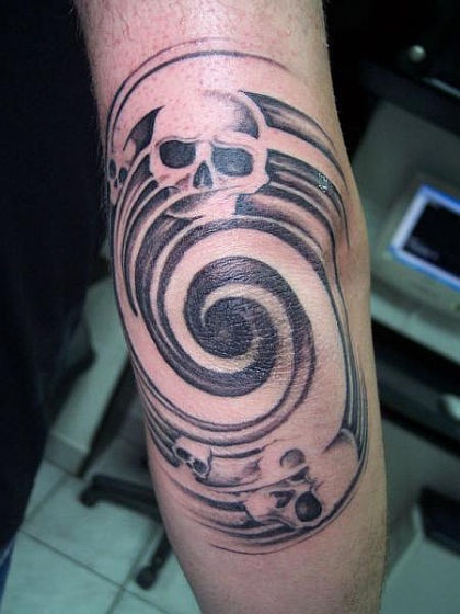 There is a swirling shadow around the skulls, and they move toward the center, which creates an interesting effect. This is dramatic while maintaining a soft presentation. The design creates the illusion of depth and movement, an old-school trick, by using gradient rings around the elbow. It is Gothic in nature and can be paired with traditional American style. For those who want a bold and mysterious design, this tattoo is an ideal choice.