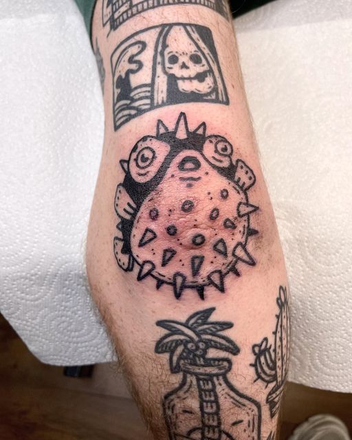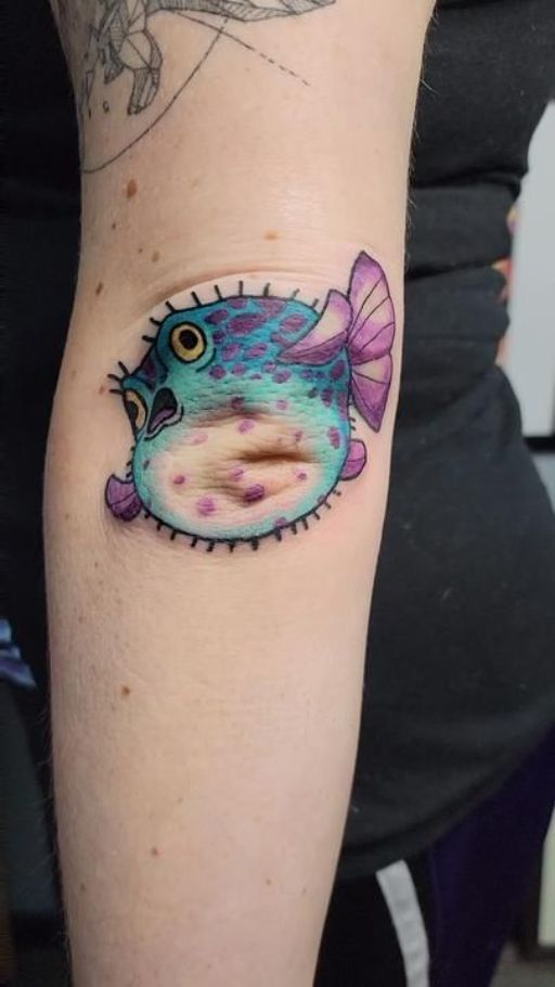 This spiky pufferfish turns the elbow into a playful bubble of character—round, expressive, and delightfully quirky. Dotwork texture adds dimension without heavy fill, keeping the design breathable for the crease. It leans old school in attitude with a contemporary line economy, making it a fun accent in a patchwork collection. The circular body means it reads perfectly from every direction.