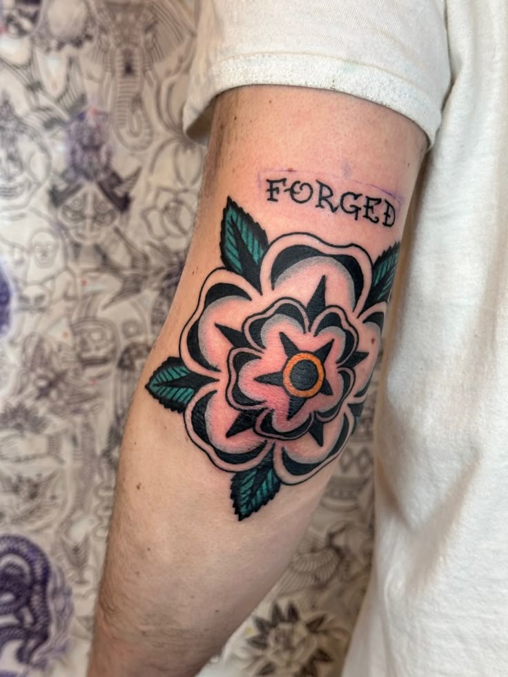 A classic rose blooms over the elbow with confident black lines, leafy points, and a warm blush center. The small script above adds personal meaning without stealing focus. This is American traditional at its friendliest—bold, readable, and forever stylish. The shape sits just outside the cap, so the petals look pristine when your arm bends and extend neatly when straight. It’s a timeless floral emblem that complements both patchwork and cohesive sleeve plans.