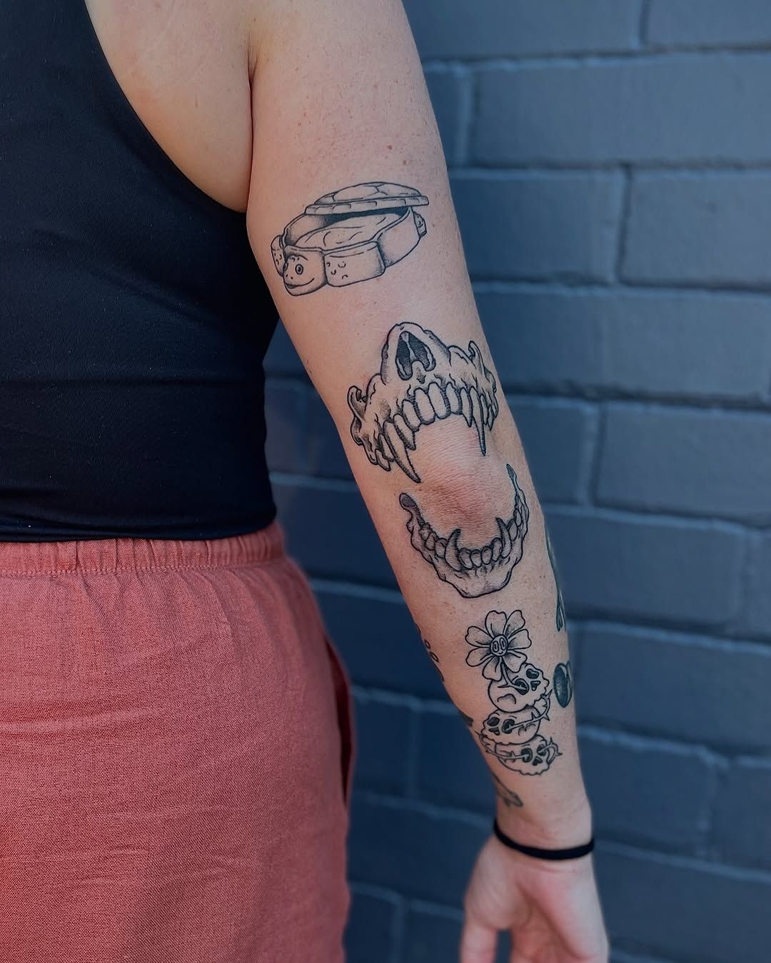 A bold skull wraps the joint like a theatrical scream, using negative space so the elbow becomes an open mouth. Heavy black and smoky gradients give it a moody Gothic presence, while simplified contours keep the silhouette clean and readable from every angle. It’s dramatic, yes, but also surprisingly elegant—think gallery-poster chic with a little outlaw wink. If you love statement pieces that still feel curated, this design makes the bend of your arm the main stage without overwhelming the rest of a sleeve.