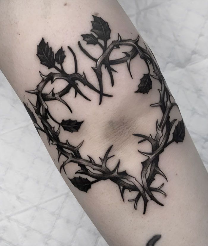 Blackwork branches knit into a heart that crowns the elbow, each thorn casting a subtle shadow for sculpted depth. It’s romantic with an edge—more Gothic poetry than drama—so it pairs with leather as easily as linen. The open center respects the bend, while the ringed silhouette makes movement part of the story. Think minimal palette, maximum emotion.