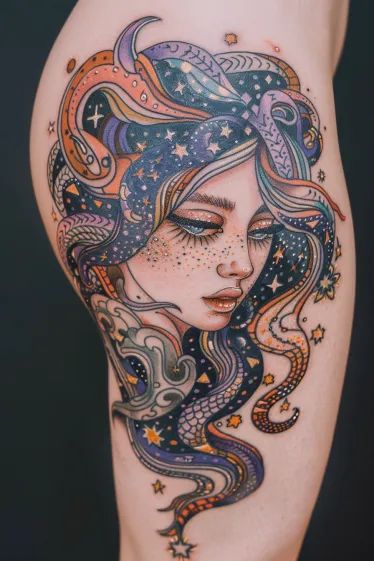 This design works beautifully on the upper arm or thigh and is especially striking for women who want mythology with a modern twist. It’s not minimalist, but it’s thoughtfully balanced, making it a standout choice for women who want something expressive and unique.