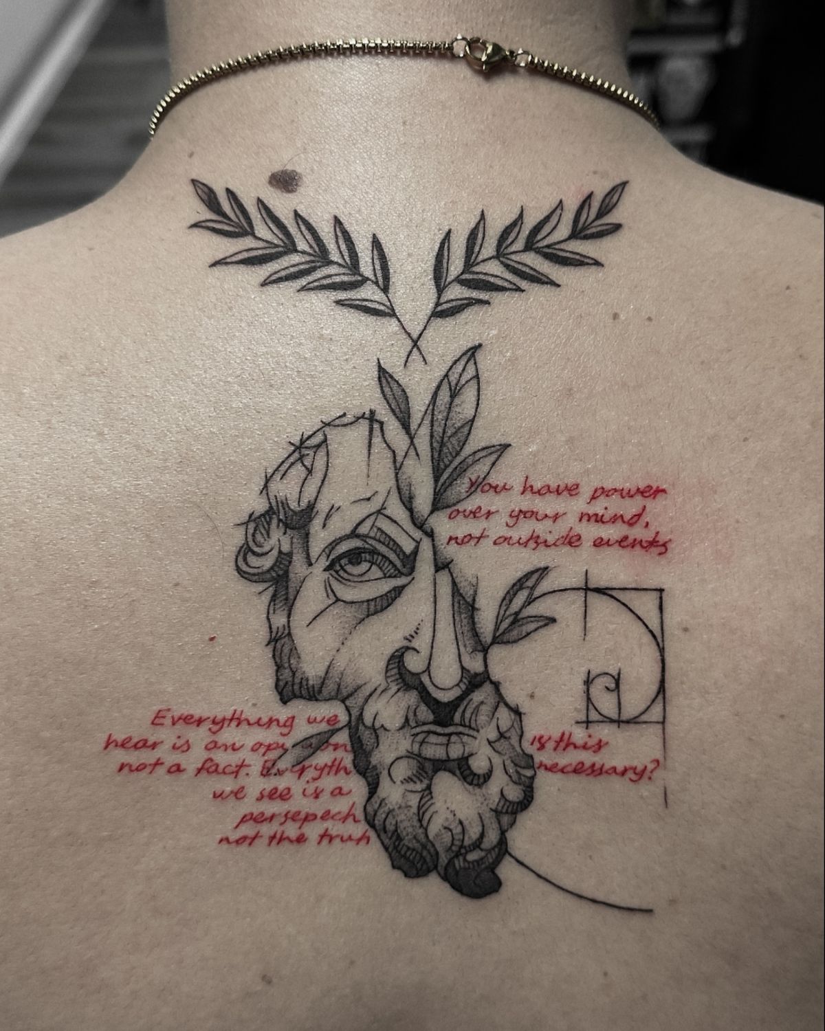 There’s something deeply grounding about this tattoo—it feels thoughtful, calm, and quietly powerful. The fragmented classical face, olive branches, and handwritten text give it an intellectual, almost meditative quality. It doesn’t scream for attention; instead, it invites reflection. This is the kind of design that feels like a personal philosophy etched into skin.