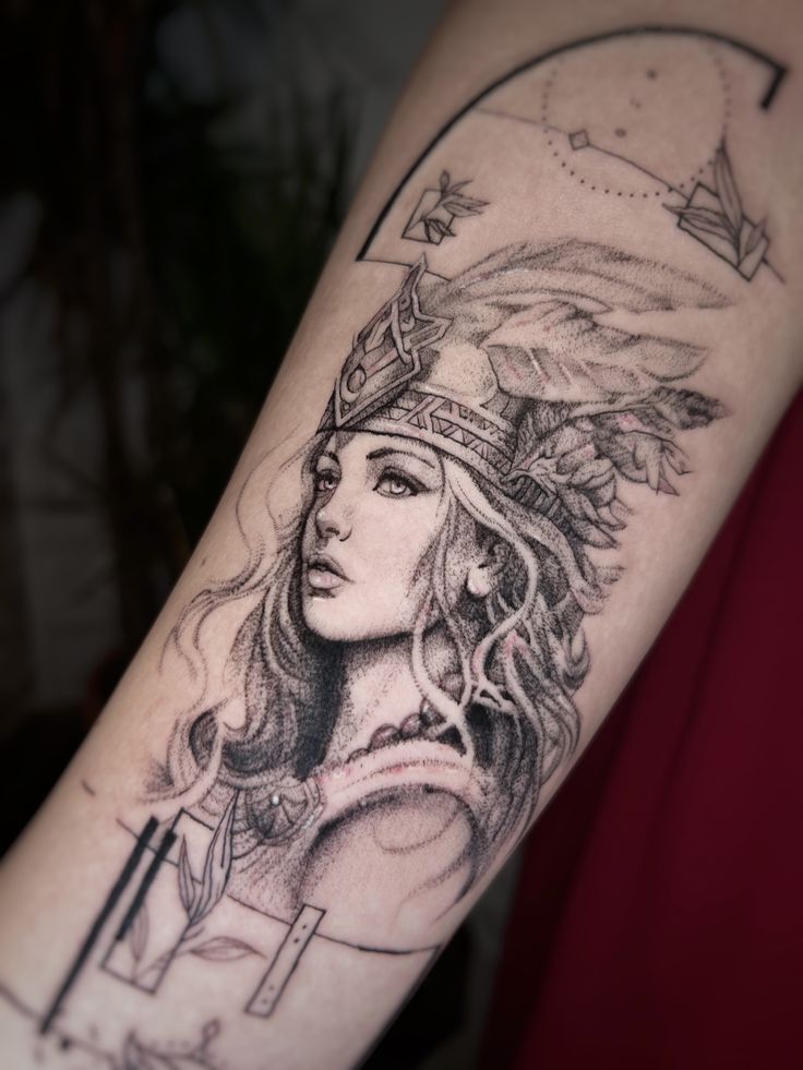 This tattoo is especially meaningful for women drawn to women goddesses in mythology. It works well as a forearm or upper arm piece and fits beautifully into sleeve women’s designs. Athena is ideal if you want a tattoo that feels empowering without being loud.