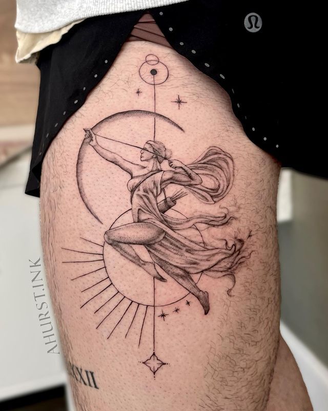 This fine-line design suits the thigh or upper leg beautifully, especially for those who prefer a minimalist aesthetic with meaning. It’s a great option if you want something simple but symbolic, and it works well for both men and women looking for refined mythology-inspired ideas.