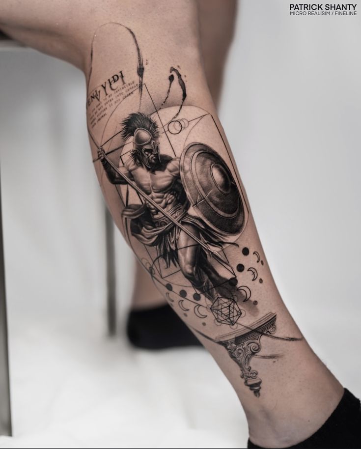 This design feels like motion captured mid-thought—dynamic, sharp, and intensely focused. The warrior appears almost suspended in time, surrounded by geometric elements that give the tattoo a modern edge. It’s powerful without feeling heavy, blending classical mythology with a contemporary design sensibility. There’s a confidence here that feels active, not nostalgic.