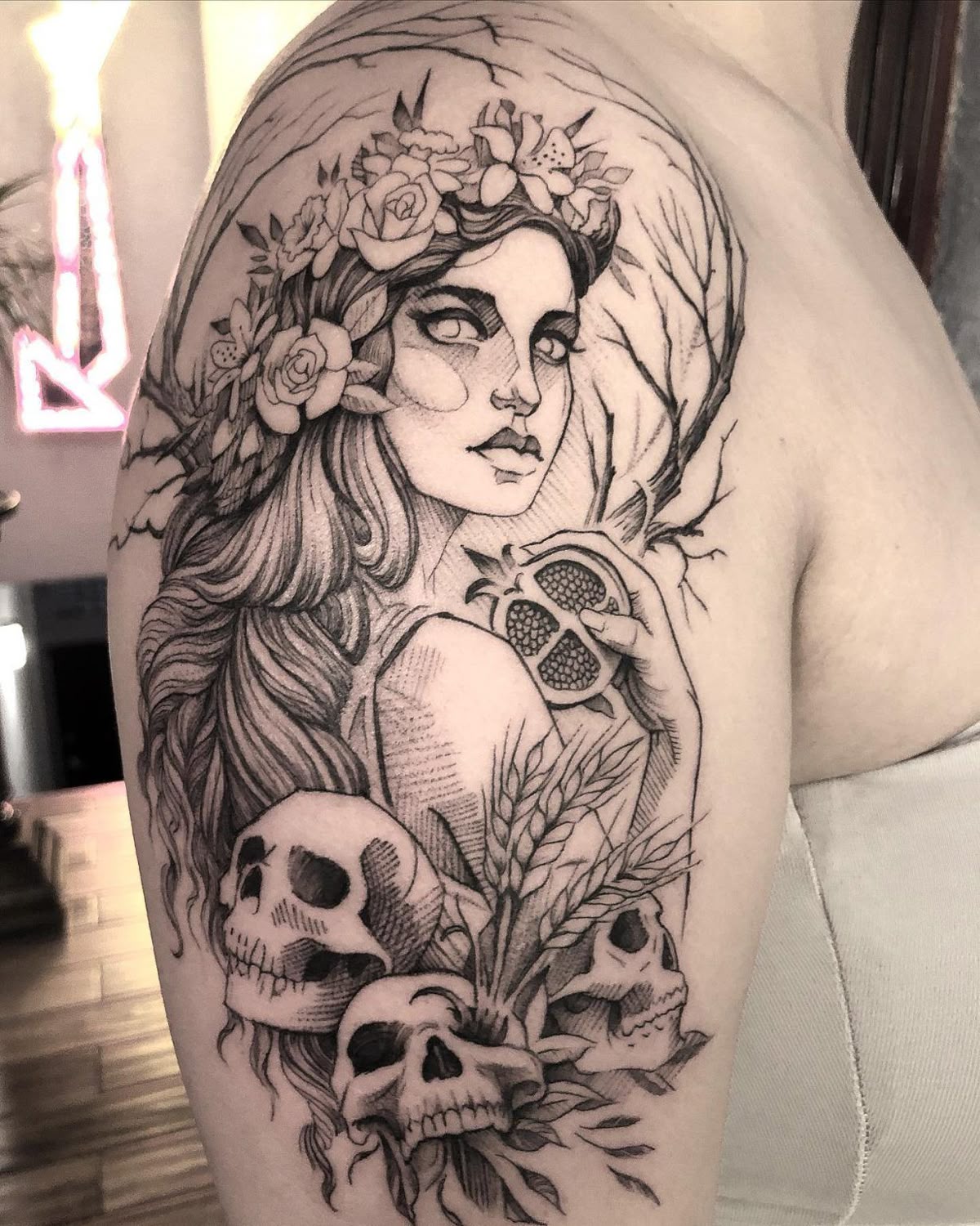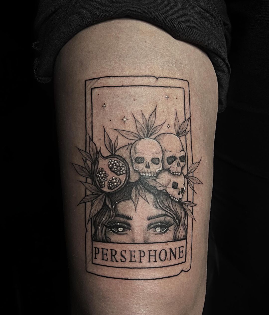 Persephone’s gaze here feels knowing, almost secretive. The skulls and pomegranate imagery create a beautiful contrast between life and death, innocence and power. It’s dark without being heavy and poetic without being obvious—a tattoo that rewards a second look.