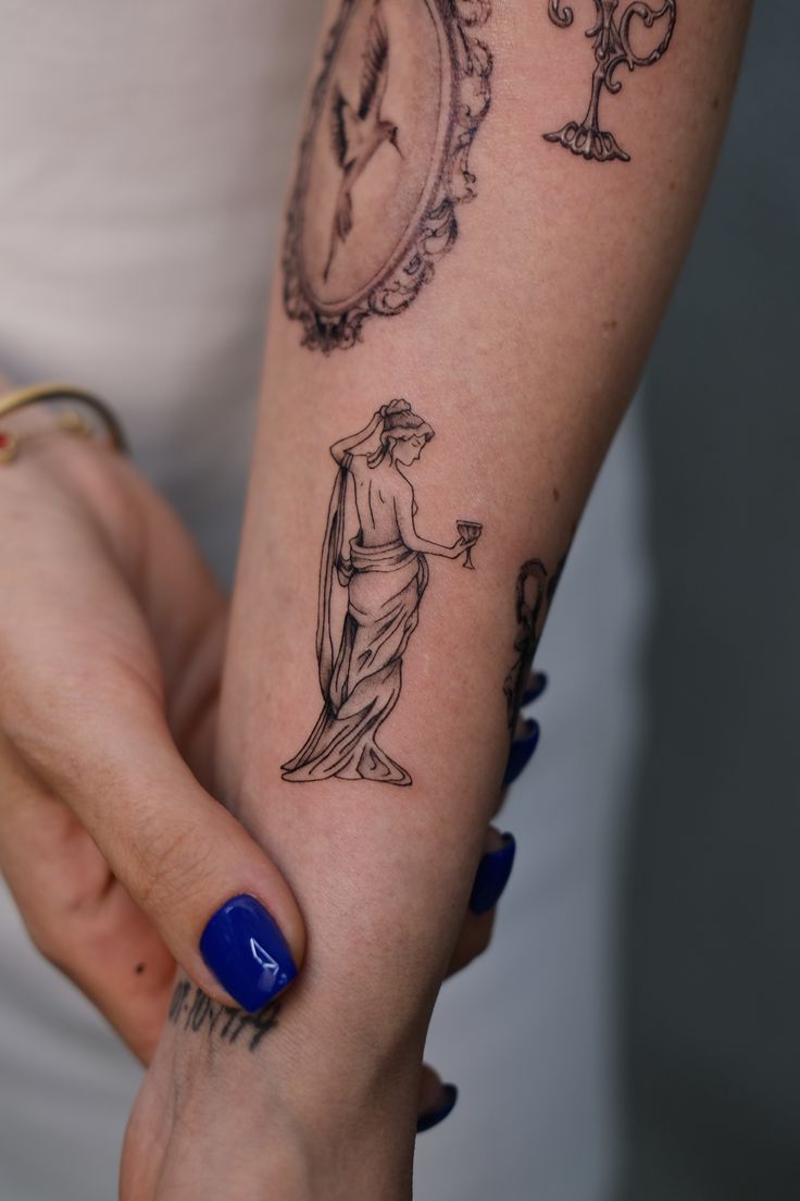 Perfect for women who love a minimalist approach, this fine-line design works beautifully on the forearm or inner arm. It’s a simple choice that still carries depth, especially for women drawn to mythology without wanting something overpowering. Light, refined, and endlessly wearable.