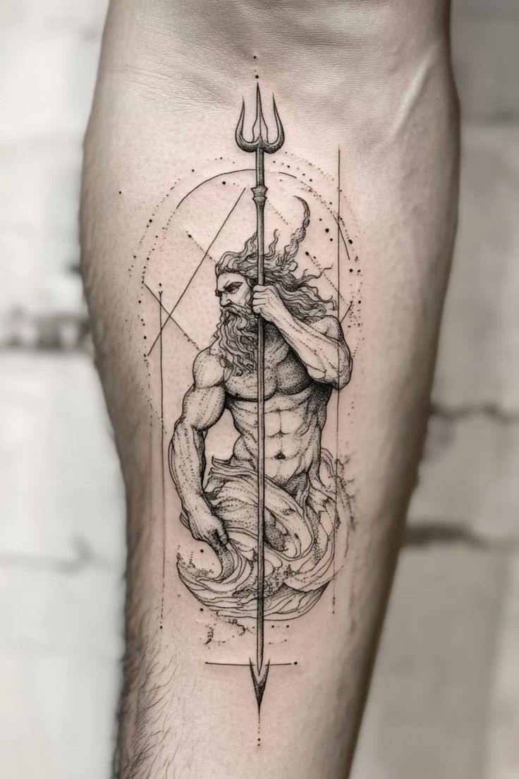 This Poseidon design feels raw and elemental—like the sea itself given human form. The geometric lines frame the figure beautifully, adding structure to the movement and giving the tattoo a modern edge. It’s powerful, masculine, and quietly commanding.