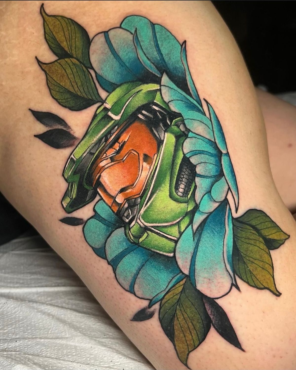 This piece is pure contrast in the best way: the hard, angular lines of the Master Chief helmet wrapped in lush petals and leaves. The bright orange visor glows warmly against the teal and green florals, giving the whole tattoo a soft, almost romantic feel. It’s like guardian angels for gamers—armor and beauty protecting you at the same time. If you’ve ever felt that the game got you through rough seasons, this is such a lovely way to honor that story without losing your feminine side.