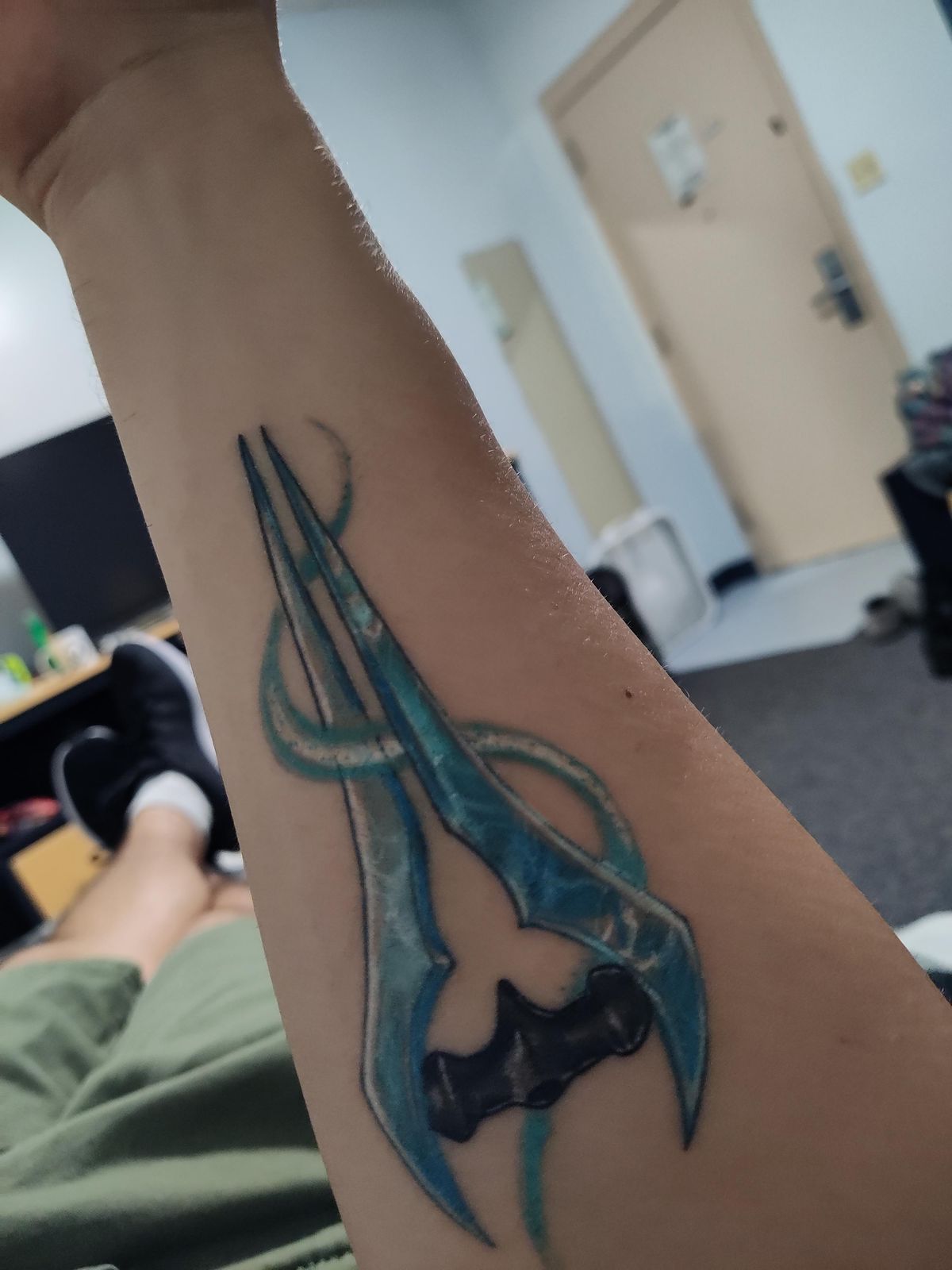 This slim, ice-blue blade looks like it’s humming right under the skin, ready to power up at any second. The looping halo around it softens the weapon just a touch, turning it into a symbol of focus and control rather than pure aggression. It’s the kind of piece that makes you feel a little tougher just glancing down at your arm, like you’ve brought a bit of the game world into real life. Minimal background, all edge and energy—definitely one for people who don’t shy away from sharp lines.