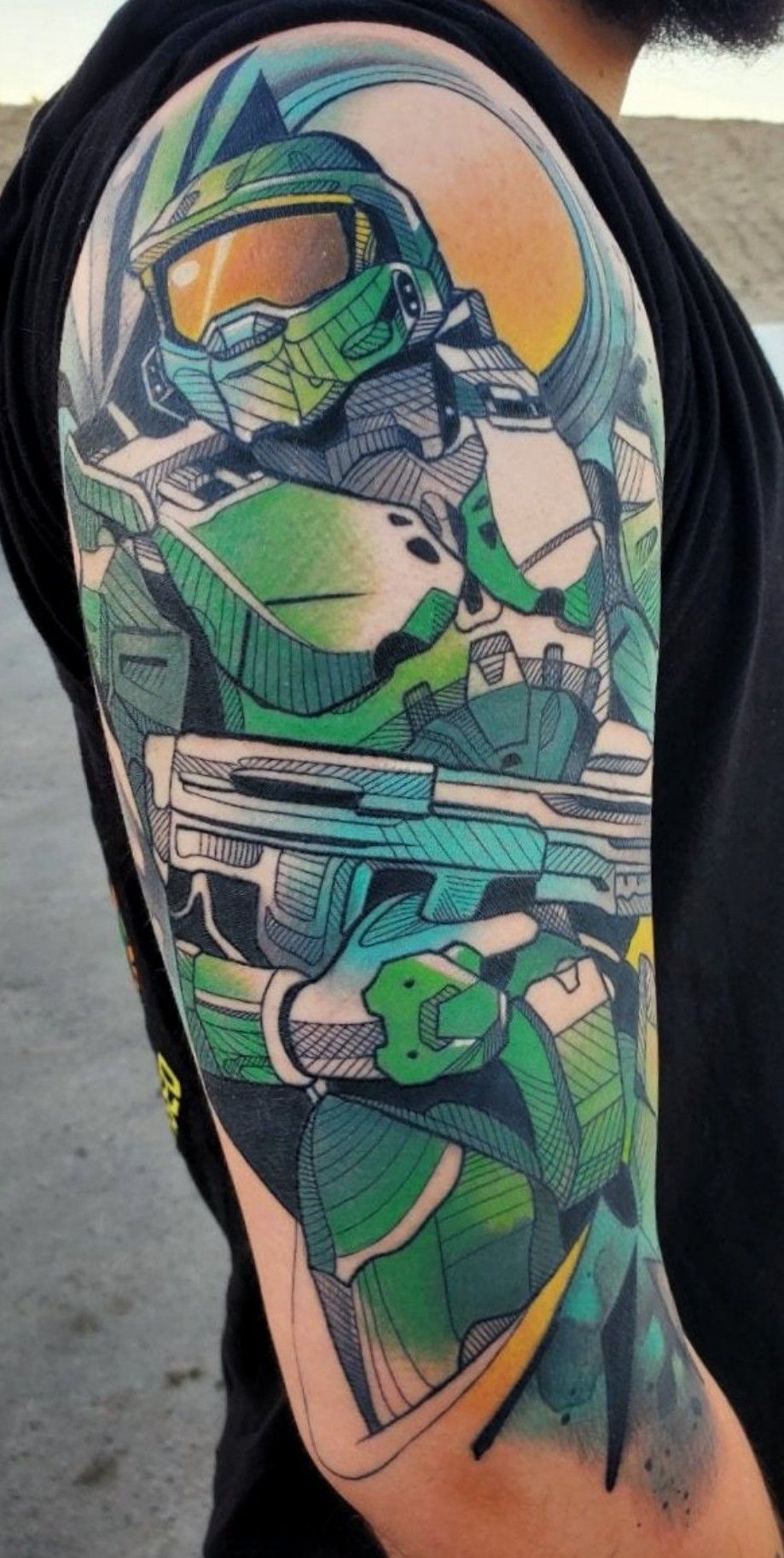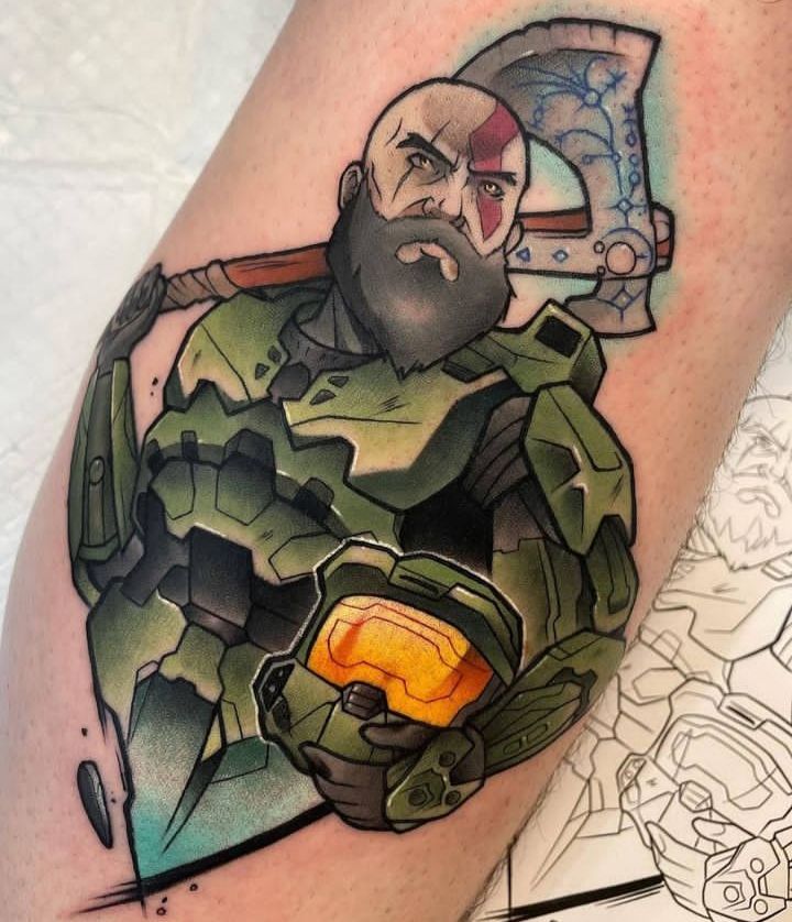 Here’s where fandoms collide in the best possible way. You’ve got a grizzled warrior with Kratos vibes wrapped in a familiar green armor that screams Master Chief, all done in bold comic-book color. The axe slung over the shoulder, the stern stare, the rich oranges and greens—it’s like someone froze an epic crossover moment and dropped it straight onto your skin. This is a halo tattoo for people who’ve spent years in the game and aren’t afraid to show exactly how legendary their love for it really is.