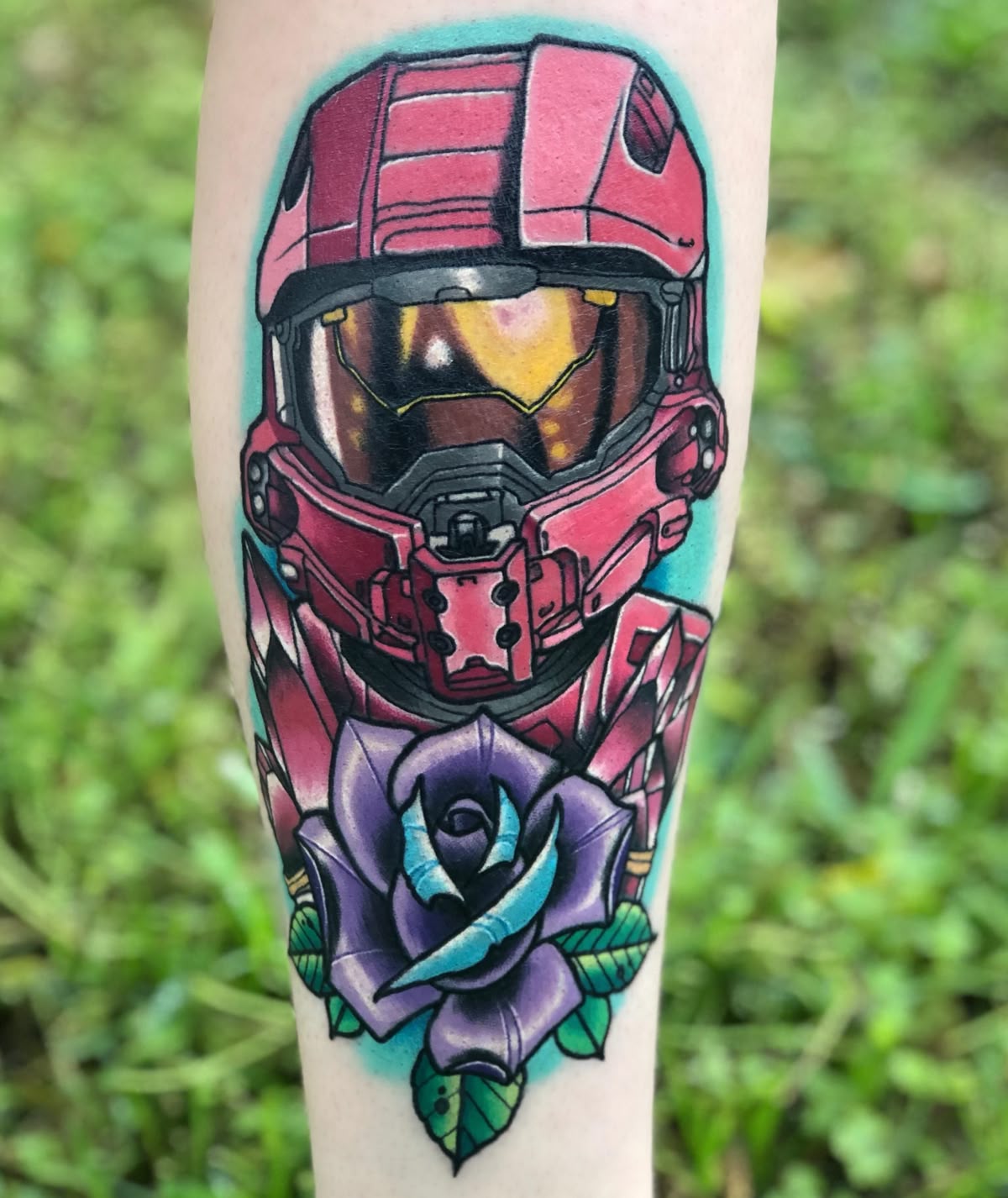 This tattoo feels like the cool cousin of traditional pin-up art: a bold pink Spartan standing strong over a lush purple rose, all framed by teal highlights. It’s playful and powerful at once, almost like the armor itself has dressed up for a night out. The colors are unapologetically bright, leaning into the fun side of the game while still honoring that unshakable, 117-level courage. If you’ve ever wished for armor that matched your favorite lipstick, this is that wish in ink form.