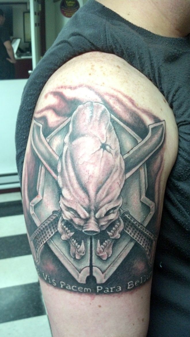 If you’ve always had a soft spot for the Covenant side of the story, this shoulder tattoo leans hard into that darker, more dangerous beauty. A snarling Elite skull sits front and center, framed by crossed weapons and a shield-like background that feels straight out of a military insignia. The black-and-grey shading gives it a sculpted, almost stone-carved look, like an ancient relic dug up from some forgotten ring world. It’s intense, unapologetic, and made for anyone who loves the game’s more ruthless characters as much as its heroes.