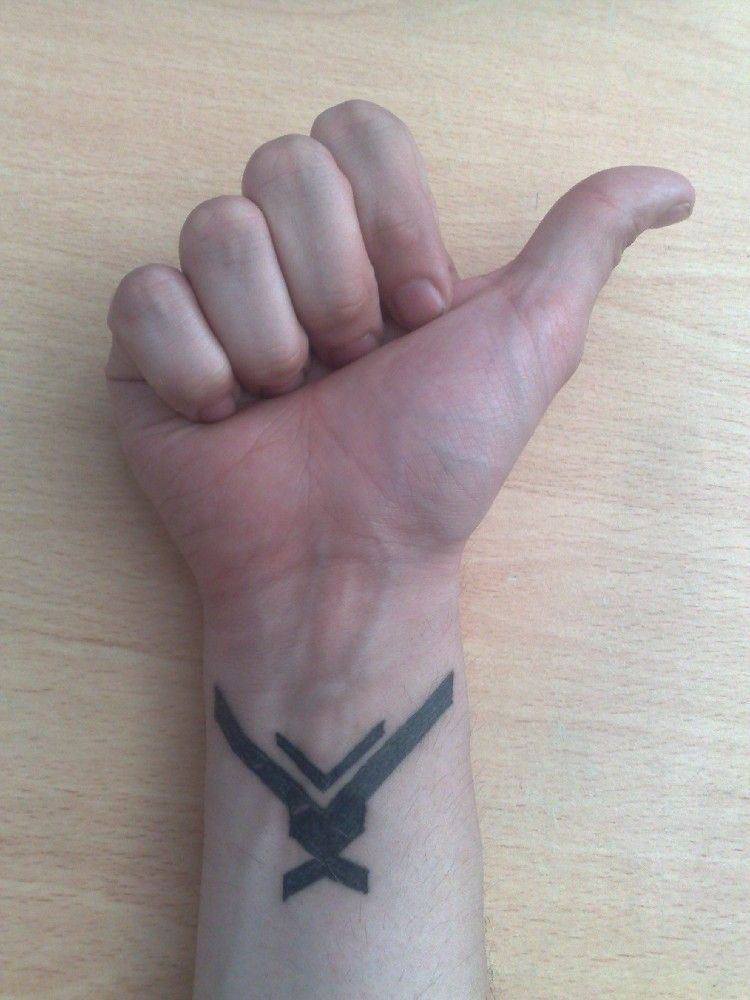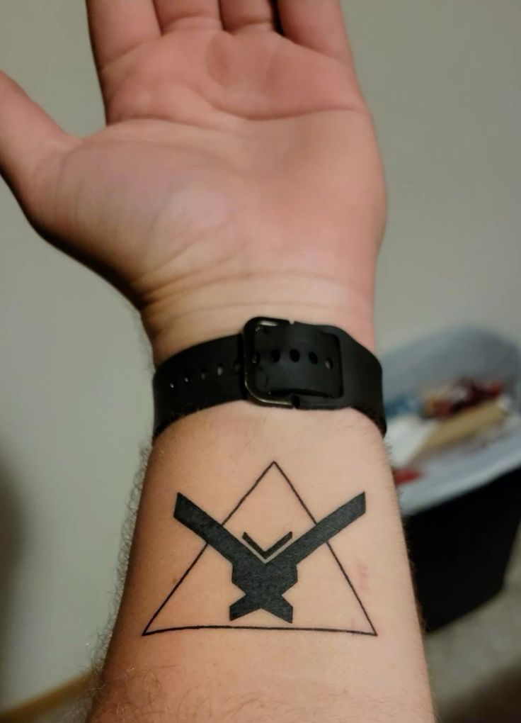 This small, angular emblem on the wrist is all business: solid black, strong edges, and a shape that hints at ranks, squads, and hidden missions. It’s the kind of tattoo that looks like it belongs on a uniform, which is exactly why it feels so cool in everyday life. On a bare wrist it’s bold; peeking out from under a sleeve, it becomes a little secret handshake for anyone else who recognizes the symbol from the game.
