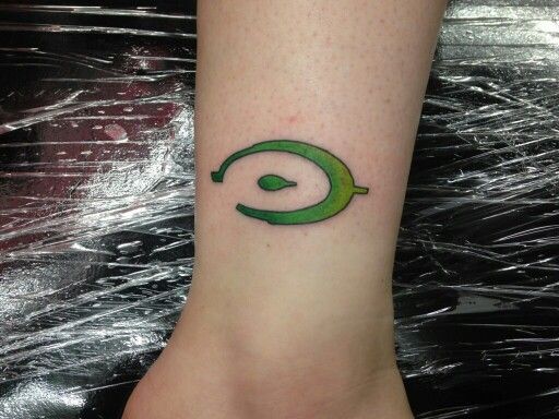 Not every Halo tattoo has to shout; some just whisper, “I know the lore,” and move on. This black wrist glyph is beautifully simple, all curved lines and intersecting arcs that look like they could be an ancient symbol or a futuristic logo. It’s the kind of design that makes people ask, “What does that mean?” and lets you decide how much of your gamer heart you want to share. Sleek, graphic, and a little mysterious—almost like a tiny secret between you and the universe.