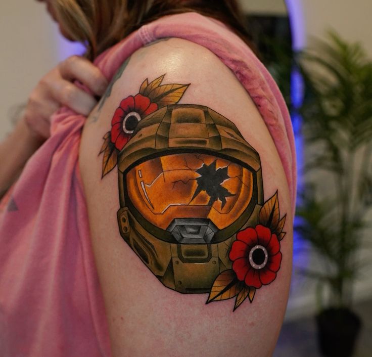 In 2025, we’re seeing more people blend “traditionally masculine” imagery with flowers, and this design nails that trend. It works fabulously on a thigh or upper arm where there’s space for those bold petals to breathe. Ask your artist for saturated color and smooth gradients so the blossoms feel lush, almost like classic flash but with a sci-fi twist. This kind of tattoo ages gracefully too; as long as you moisturize and protect it from the sun, the florals and armor alike will keep their rich, painterly depth.