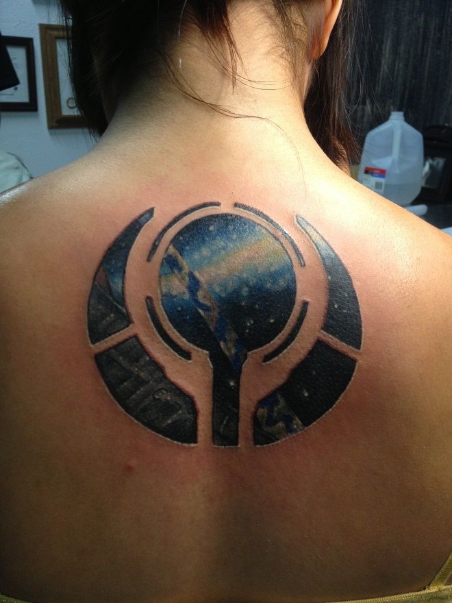 This halo tattoo feels like carrying your own private galaxy between your shoulder blades. The circular symbol frames a night-sky scene that looks like it’s been lifted straight out of a game cutscene, with starlight and deep blues giving it a dreamy, otherworldly glow. It’s bold without being loud, and there’s something a little spiritual about it too – like Heaven meets sci-fi. If master chief had an off-duty emblem to wear out of his armor, it would probably look a lot like this: strong, mysterious, and quietly legendary.