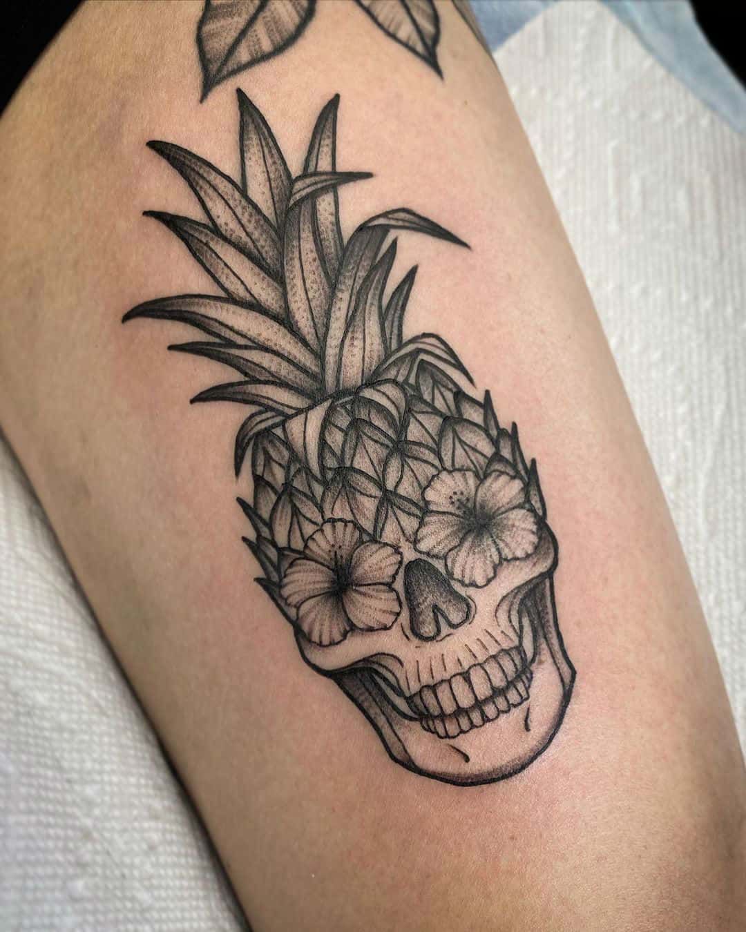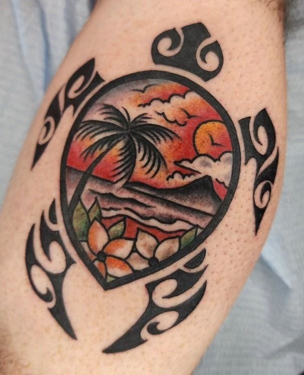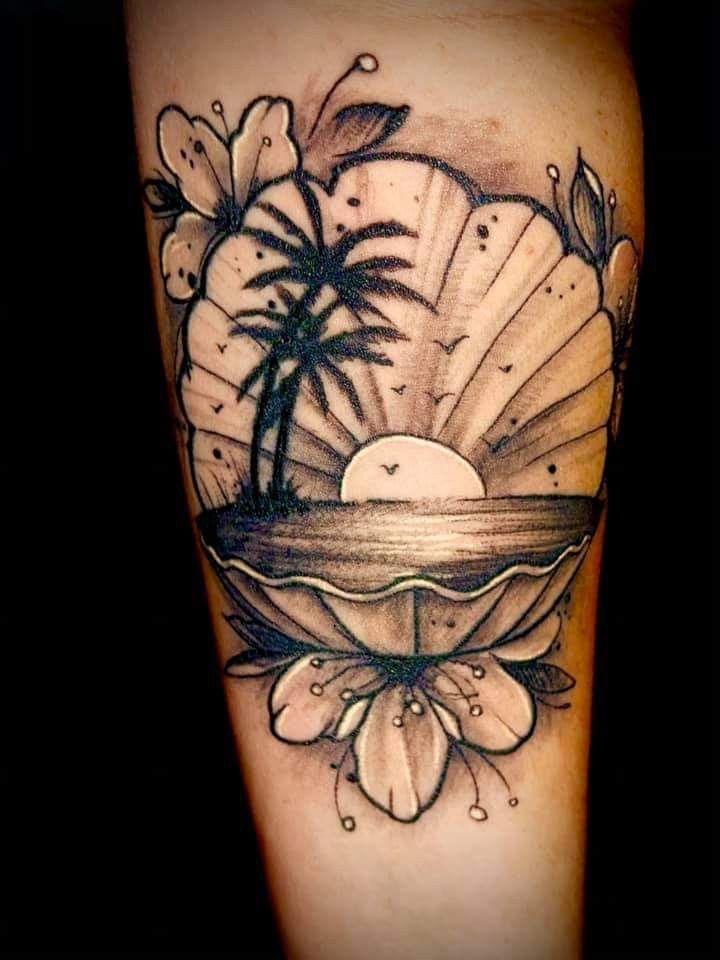 This tattoo feels like a memory you never want to forget. The soft sunset, palm silhouettes, and floral framing create a dreamy, almost nostalgic mood. It’s gentle and romantic, yet still grounded in island imagery that feels timeless rather than touristy.