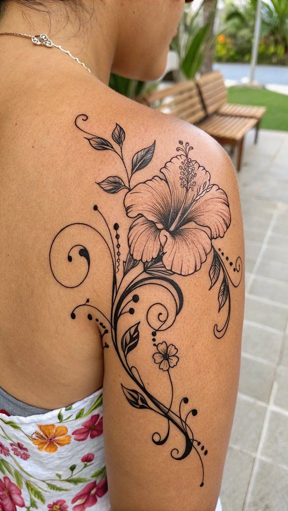 21. Fine Line Hibiscus Vine Shoulder Tattoo