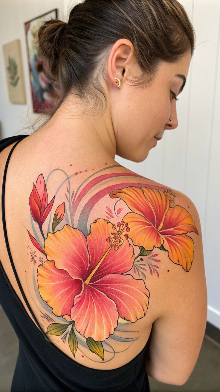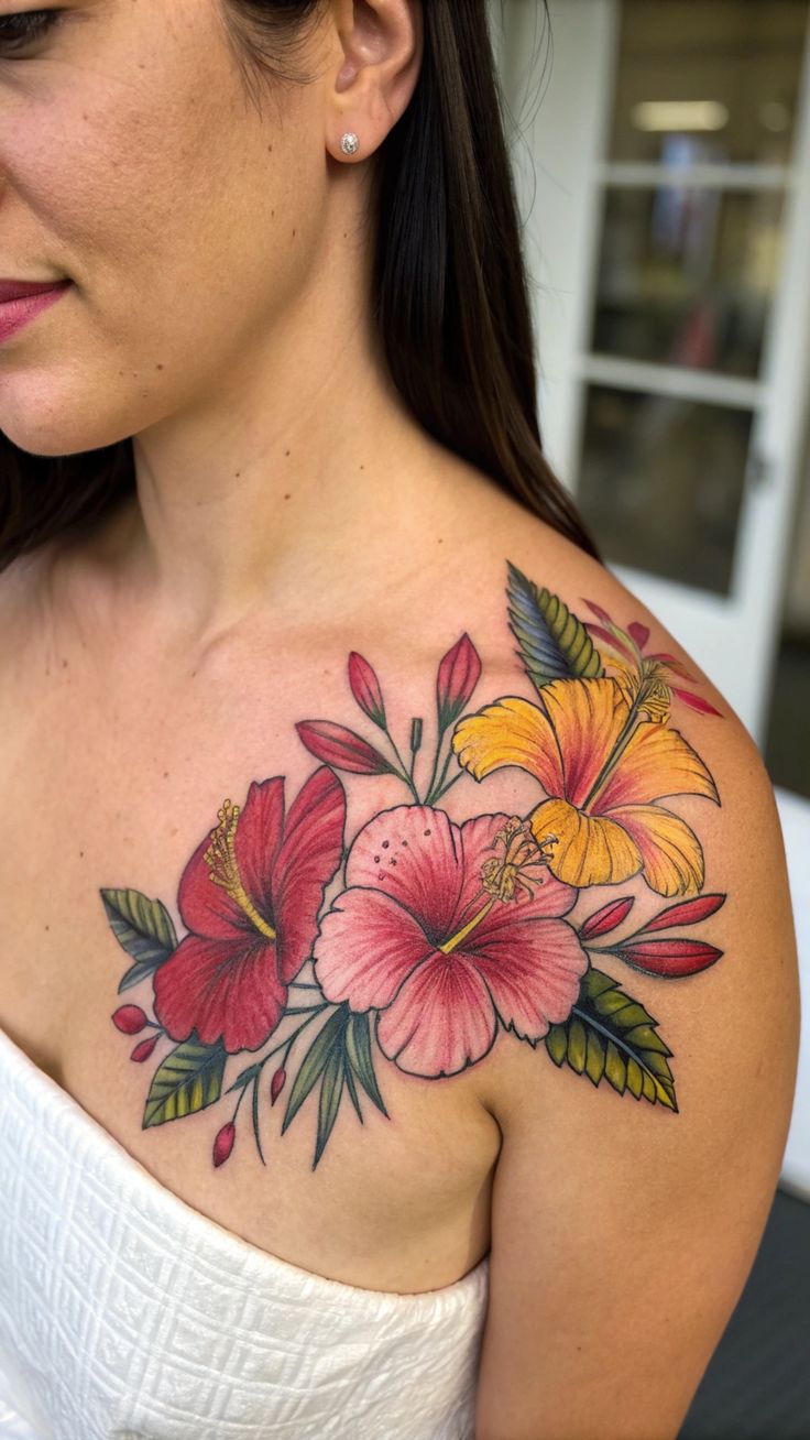 14. Color Hibiscus Shoulder Bouquet Tattoo