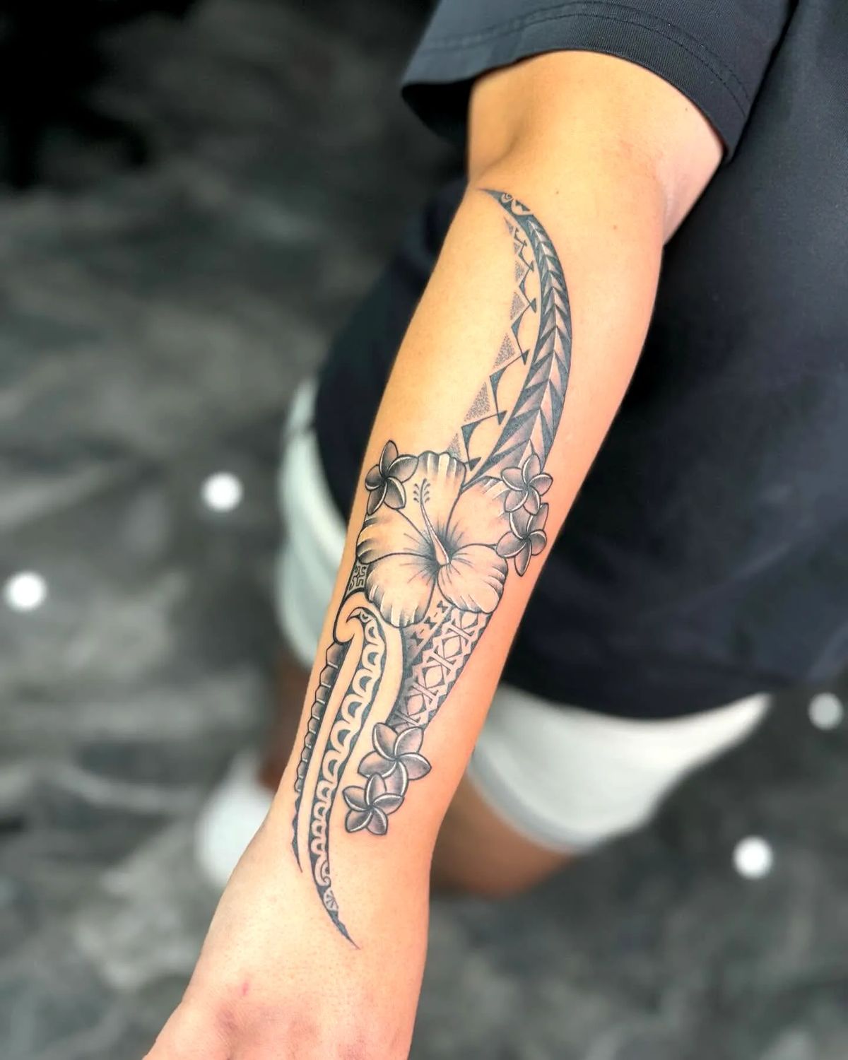 There’s something quietly powerful about this piece. The clean black lines mixed with hibiscus details give it a grounded, almost ceremonial feeling. It doesn’t chase trends; instead, it feels rooted, confident, and deeply personal, like a symbol you carry rather than something you show off.