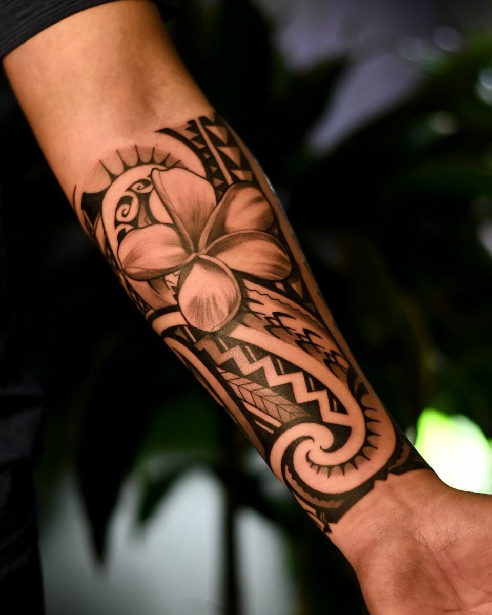 19. Polynesian Dolphin and Plumeria Forearm Tattoo