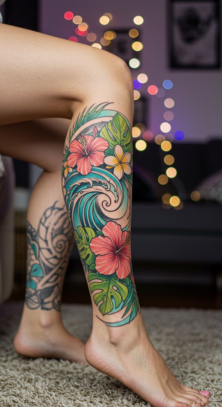 1. Tropical Wave and Hibiscus Leg Tattoo