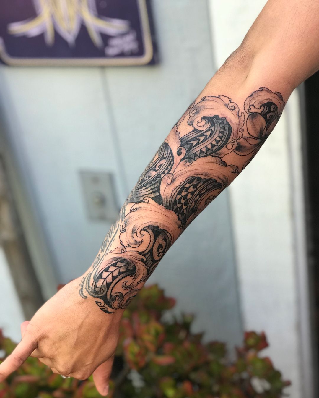 This wave-heavy sleeve feels like power in motion. The swirling water, bold tribal sections, and layered shading create a dramatic rhythm that looks strong from every angle. It has that classic island feel without looking dated, like a piece that belongs to the body instead of sitting on top of it.