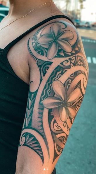 This style is perfect for women’s sleeves that embrace color and personality. It works best for those who love statement tattoos and don’t shy away from attention. Among Hawaiian tattoo ideas, this one shines for women, meaning joy, growth, and creative freedom.