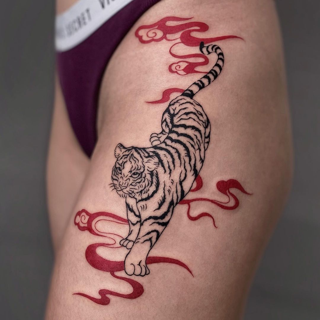 This design feels sleek and stylish, with a tiger outlined in fine black ink walking through bold swirls of red flame. The simplicity of the lines paired with the striking red details gives it a modern edge while still honoring Japanese tradition. It’s confident, clean, and unforgettable.