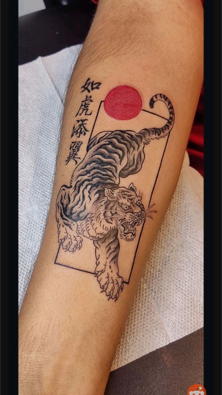 This design feels like a piece of Japanese art mounted on your skin-the tiger stepping out of a rectangle beneath the rising red sun. The simplicity of black and grey lines against that bold circle makes for a poetic and timeless statement. It is stark yet minimal and would be perfect for a person who appreciates tattoos that convey muted symbolism.