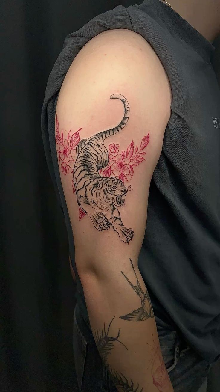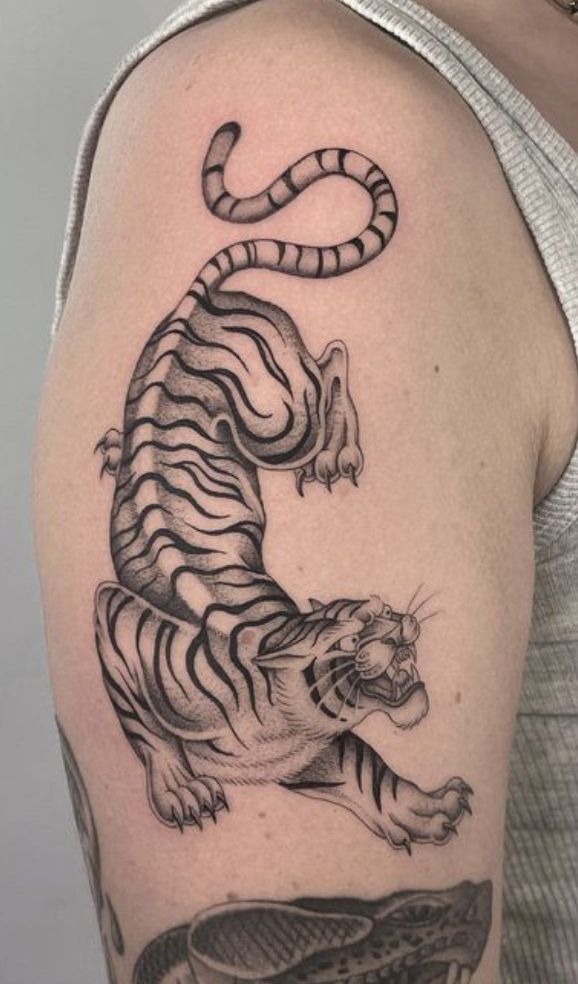 This tattoo stretches on the shoulder with the motion, almost as if the tiger is crawling down your arm. The unfortunate curved back of the tiger, powerful paws, and fluid lines provide a sense of motion that feels alive every time you flex. There is a fierce beauty in this design that balances strength and grace equally.