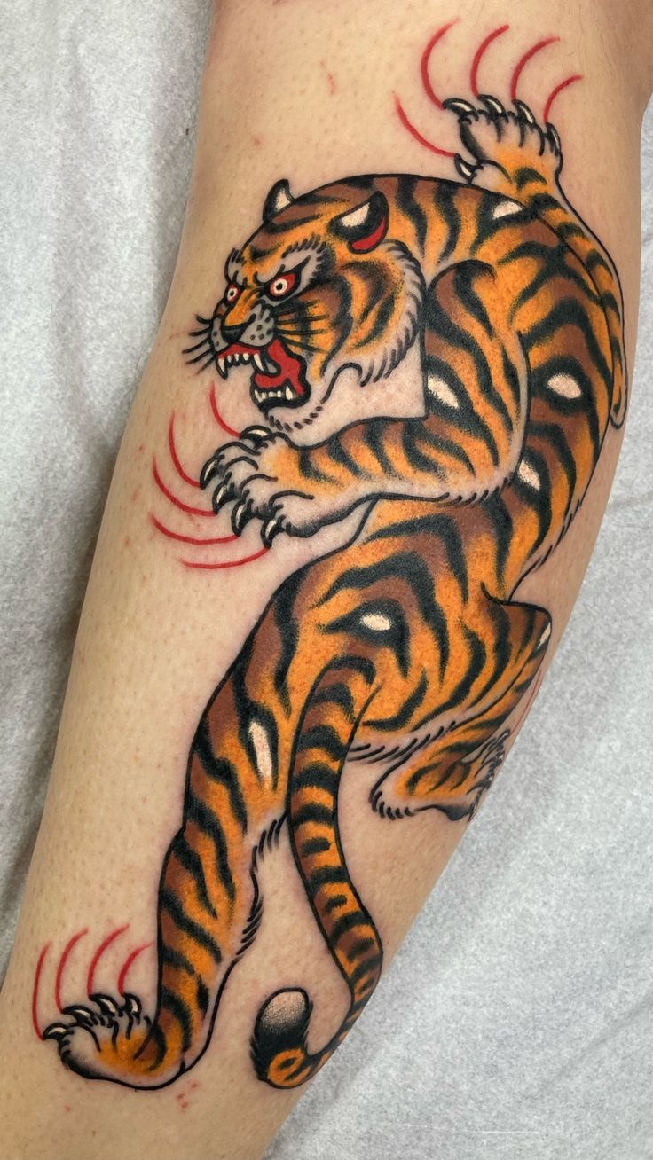 With its sharp claws and fiery expression, this tiger tattoo bursts with the raw energy of Japanese traditional art. The bold orange and black stripes are heightened with dynamic red streaks, giving the impression that the tiger is alive and mid-swipe. It’s wild, fearless, and makes you feel like you’ve captured a piece of ancient power on your skin.