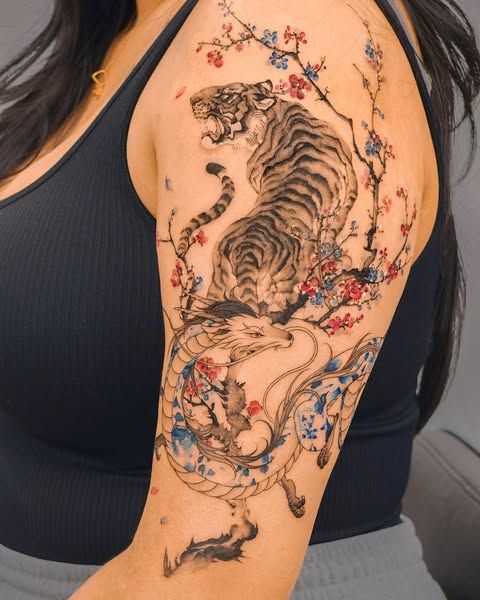 Here’s a breathtaking full arm piece combining a powerful tiger with a winding dragon, surrounded by delicate cherry blossoms. The balance of strength and serenity creates a dynamic harmony, almost like yin and yang brought to life on skin. It’s detailed, vibrant, and endlessly captivating.