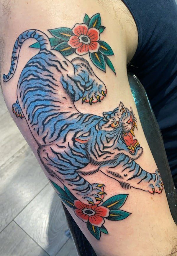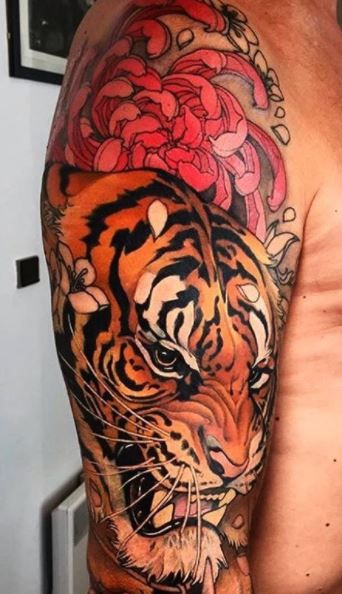 This tattoo mingles ferocity and beauty, with a roaring tiger set off by delicate red blossoms. The harshness of those black stripes has to deal with the gentleness of the petals, for strong and elegant contrasts. It’s a design that leans artistic but doesn’t lose any edge.