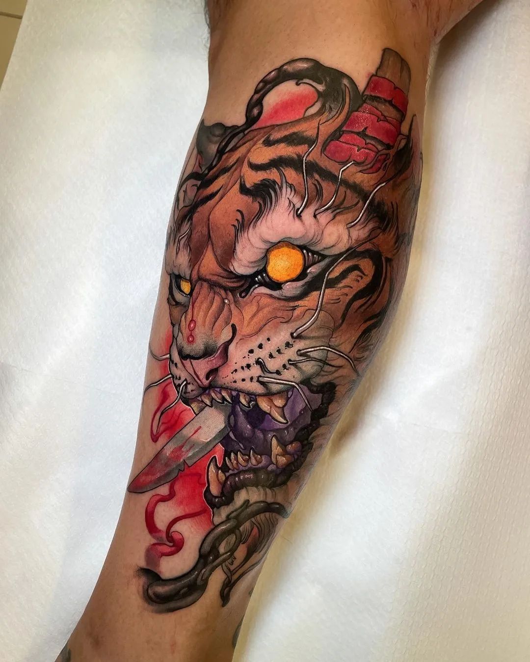 This tattoo has a darker and edgier feel-the glowing orange eyes of the tiger are locked in a deadly stare while its jaws clamp on a blade. Flames and smoke surround the piece, making it feel like a scene pulled straight out of a myth or warrior’s tale. It feels dramatic, dangerous, and enormously powerful.